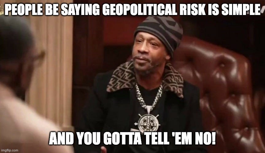 😩 Tying geopolitical risk into investing decisions is hard - it’s (A LOT) more than just adding another indicator to your stock screener. Big opportunity for robust frameworks - maybe looking at the evolution of ESG and sustainability criteria for inspiration.